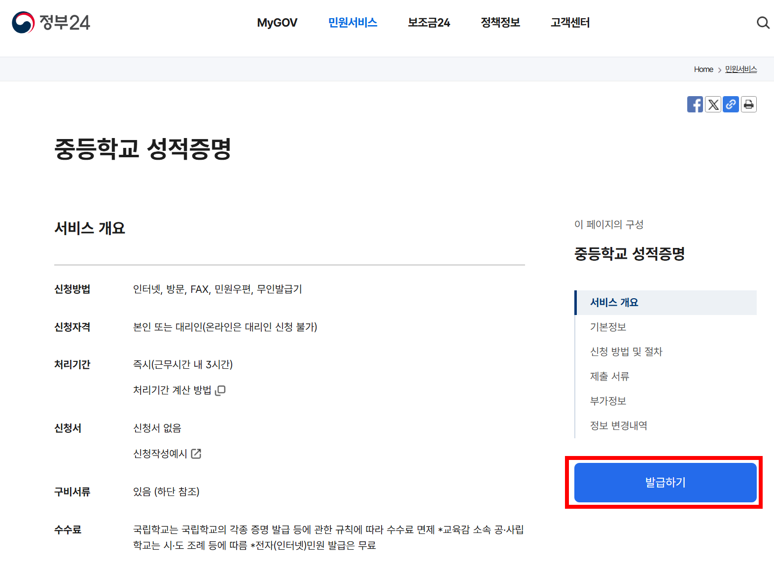 발급 비용 및 처리 시간