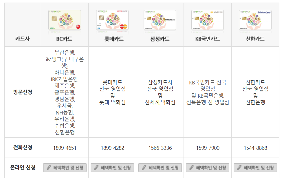 - 온라인 신청: 국민행복카드 공식 홈페이지 또는 각 카드사 홈페이지에서 간편하게 신청 가능합니다.
