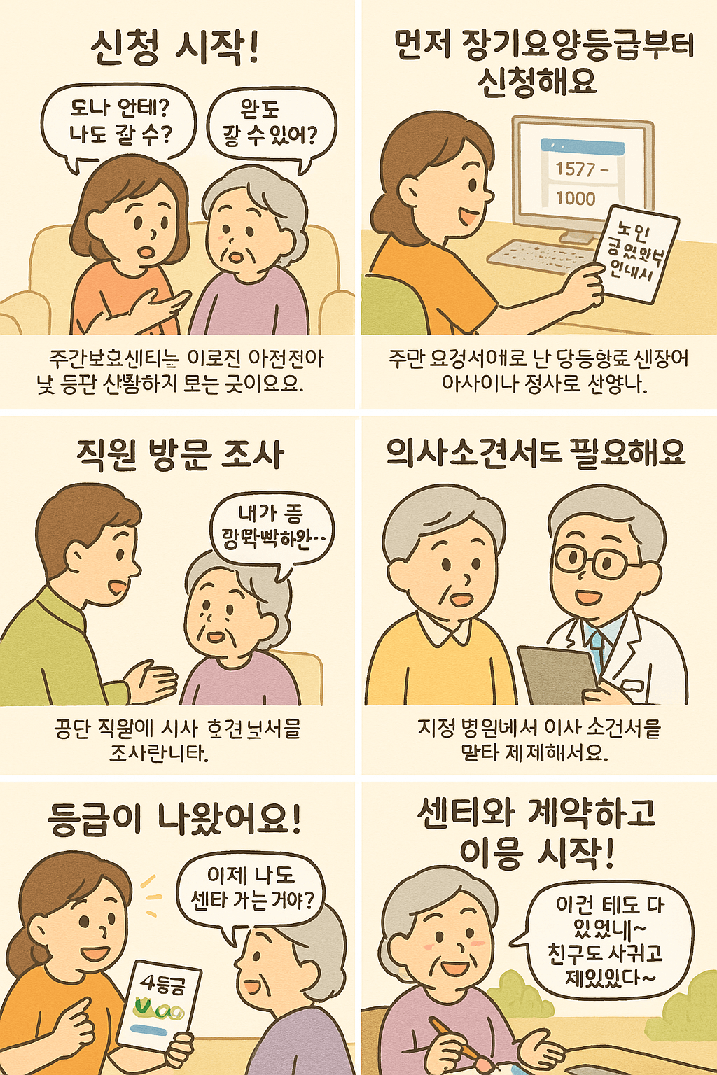 신청 후 약 1~2주 내에 공단 직원이 어르신 댁으로 직접 방문해 건강 상태, 인지 능력, 거동 여부 등을 종합적으로 조사합니다.