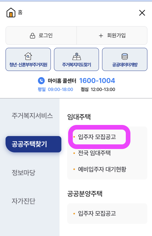 2. ‘입주자 모집공고’ 메뉴 선택