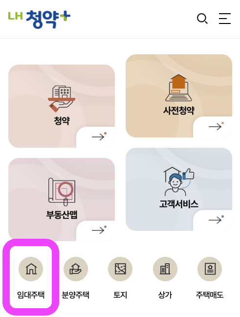 메인화면으로 오면 ‘임대주택’를 클릭하면 바로 검색이 가능합니다.