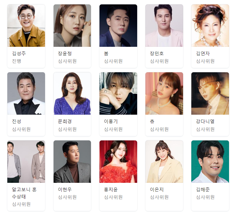 현재 심사위원들은 이미 정해져 있습니다. 전부 14명의 심사위원으로 구성되어 있으며, MC는 시즌1에서도 활약한 명 MC 김성주입니다. 빠질 수 없는 감초 같은 인물인 붐도 심사위원으로 그대로 나오게 됩니다.