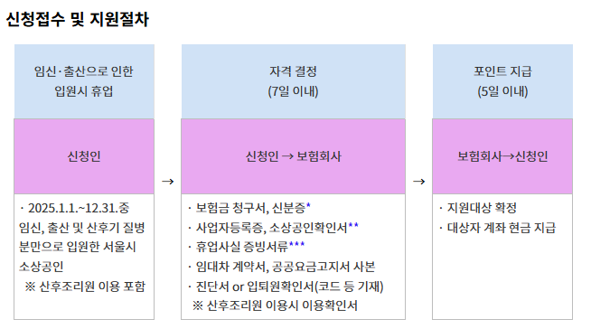 | 지원 대상 | 주민등록·사업장이 서울시 내 위치, 보험금 청구일 기준 1년 이상 사업 운영, 임신·출산 증빙 서류 제출 |