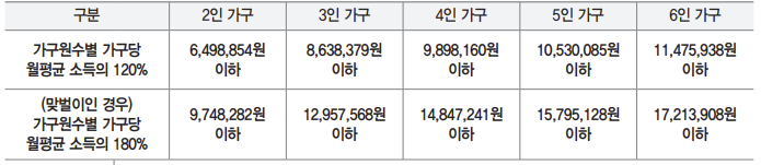 - 전용면적 60㎡ 이하: 가구당 월평균 소득의 120% 이하 (맞벌이는 180% 이하)
