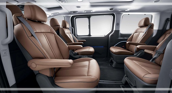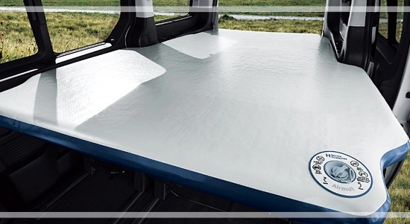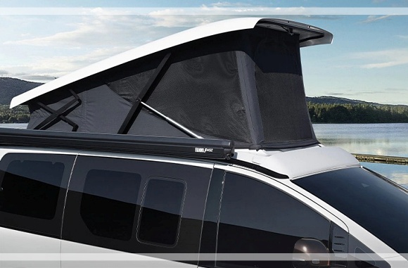 캠퍼의 전동식 팝업 루프는 곡선을 통해 공기역학적인 디자인을 적용하고 차체와 동일한 소재를 사용해 일체감을 준다. 루프를 위로 들어 올리면 성인 두 명이 누울 수 있는 공간으로 활용할 수 있고, 실내 램프와 매트리스가 마련돼 있습니다.