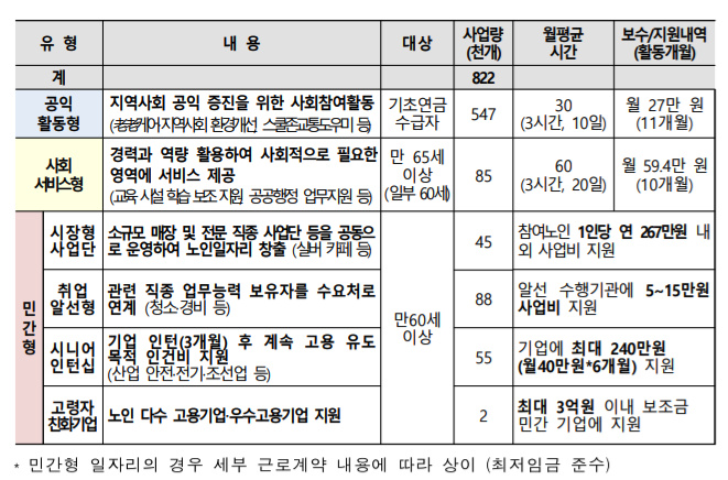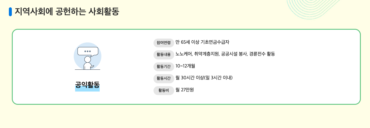 월 수입은 적지만 비교적 난이도가 낮은 일자리로써 만 65세 이상의 기초연금 수급자만 지원 가능한 형태입니다.