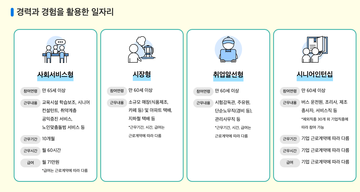 정보 사이트 안내에 앞서 매년 진행하고 있는 노인 공공 일자리 사업에 대해서 우선 소개 해드립니다. 4가지 유형의 일자리가 있으며 아래와 같습니다.