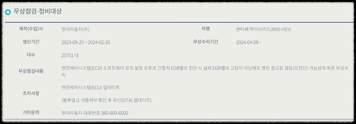 위 내용 이외에도 싼타페와 싼타페 하이브리드 차량에 대한 최신 무상수리 내용이 있습니다. ECU, MCU 오류에 대한 내용이며 아래를 참고하세요.