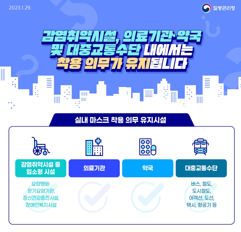 - 예를 들어 대형 마트에 있는 약국에서는 착용해야 함.