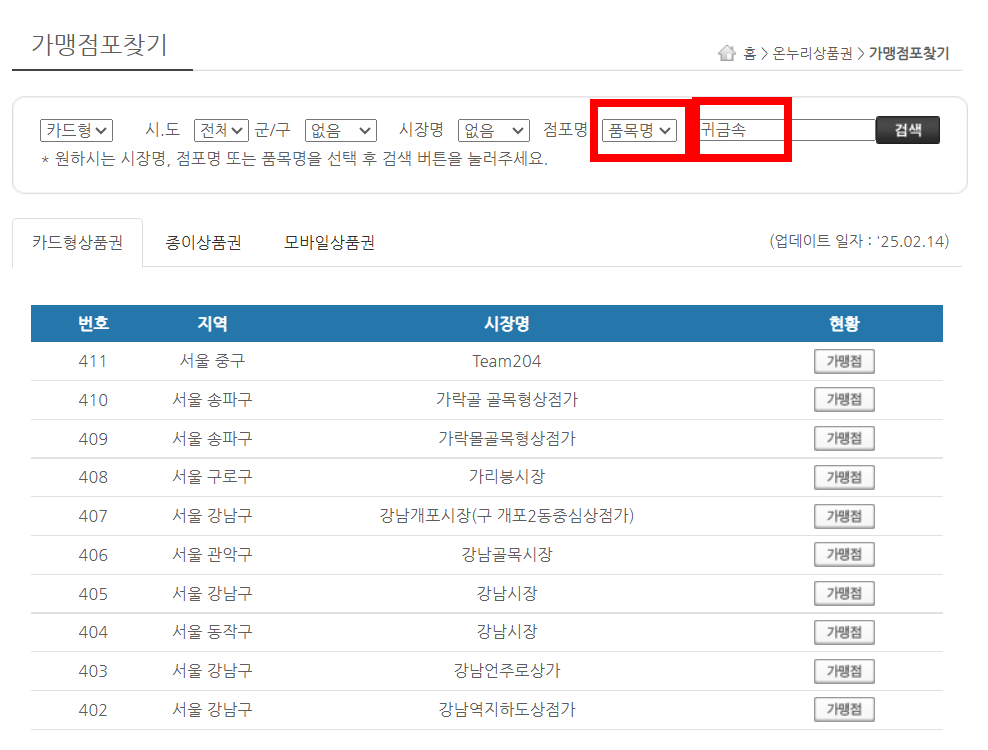 - 지류, 모바일, 카드형 상품권을 각각 지원하는 매장을 구분해서 보여줘요.