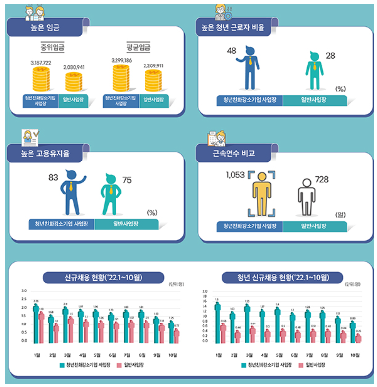 일반 기업보다 약 1.7배 높은 청년 근로자 비율을 보여주고 있습니다. 사업장 전체 근로자 2명 중 1명은 청년으로 구성되어있으며, 정규직 비율이 94%에 이른다 합니다.