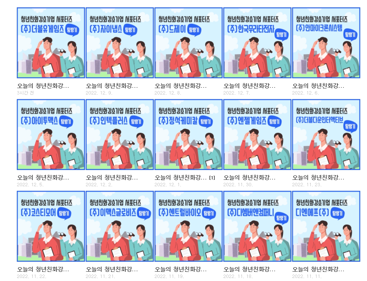 아래는 청년친화강소기업 탑방기 입니다. 각 회사의 탐방기를 보고 싶다면 아래를 클릭해 보세요.