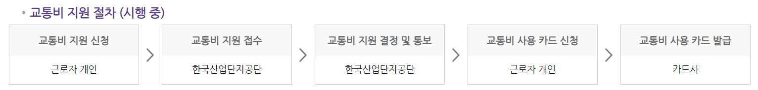 - 교통여건이 열악한 산업단지 공업단지 같은 곳의 중소기업 근무자 청년에게 매월 5만원의 교통비 지원 카드입니다.