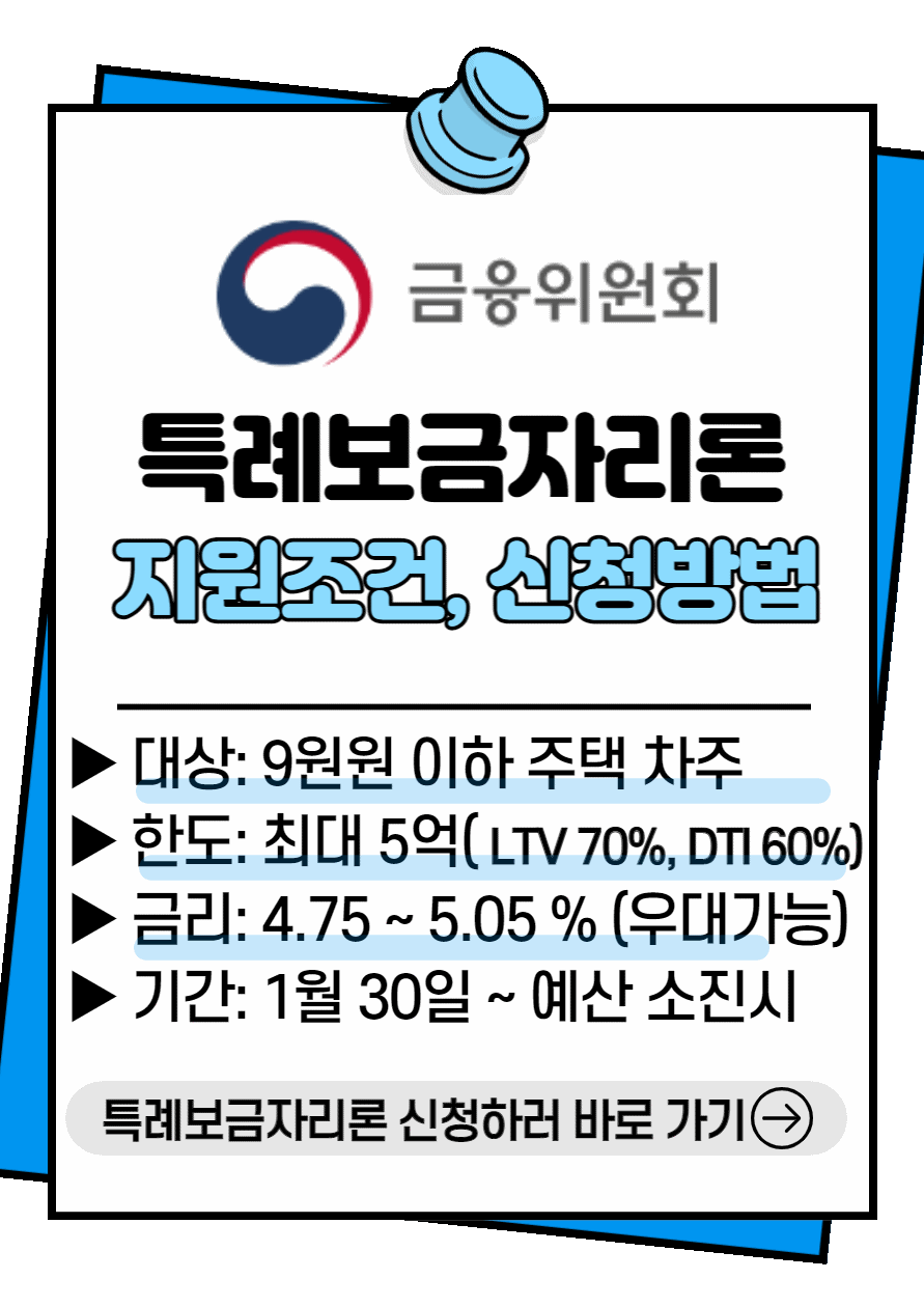 이번엔 신설된 정부정책인 특례보자리론 자격조건, 신청방법 등에 대해서 알아보았습니다. 1년 동안만 시행되는 정책인 만큼 잘 확인해 보시고, 신청하시는 것을 추천드립니다.