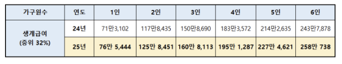 | 4인 가구 | 183만 원 | 195만 원 | 6.42% |