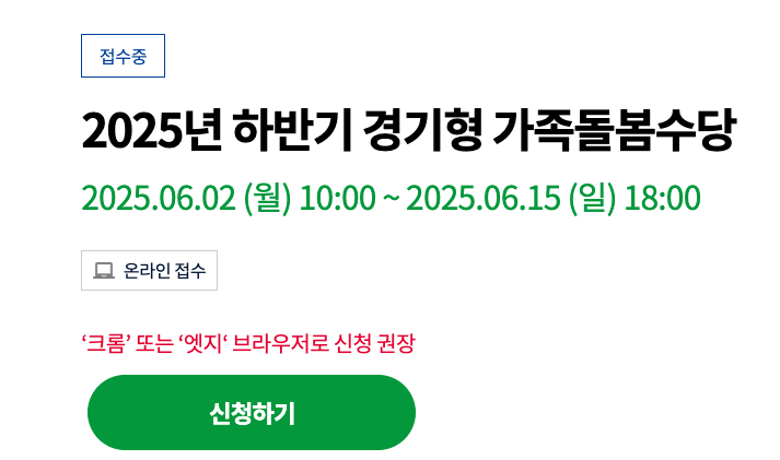 경기형 가족돌봄수당은 돌봄 부담을 덜어주는 소중한 월 30만~60만 원, 조절 가능한 돌봄 시간, 이웃 돌봄까지 가능한 제도입니다. 대상에 해당된다면 6월 2일~15일 꼭 경기민원24에서 서류 준비해 지금 바로 신청하세요!